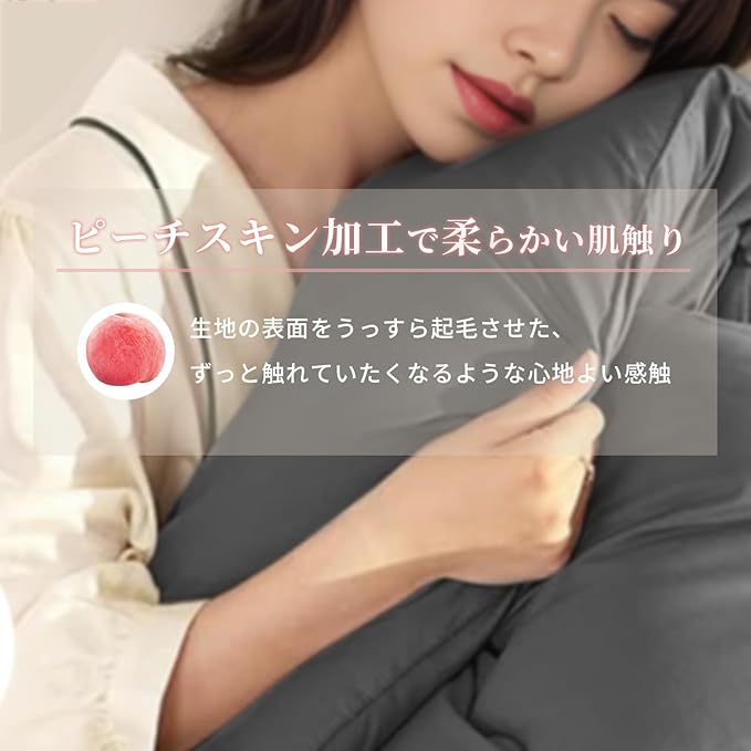 【ピーチスキン加工でとっても柔らかな触り心地】ピーチスキン加工を表生地に施し、柔らかく滑らかな肌触りに、やわらかな肌ざわり桃の表面のような。洗濯してもへたりにくく、中綿が固まりません、肌の敏感な方にも安心してお使い頂けます。