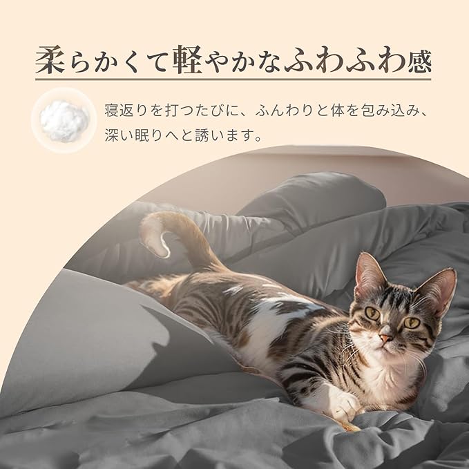 【秋冬増量・羽毛布団に負けない暖かさ】保温性を向上させるために、秋冬向け掛け布団の中綿を増量しました!暖かさがアップする一方で、圧迫感を与えることはありません。ポリエステル素材を使用し、羽毛の臭いが苦手な方や羽毛アレルギーの方におすすめです。に基づくキルティング加工も施されて、布団との隙間が少なく、身体、首元、肩口にぴったりフィットして暖かい空気を逃がしません。寝返りをよくうつ方や、横向き寝の方、寒い時期に特におすすめです。さらに、もっちりとした柔らかな触り心地が、身体を優しく包み込み、快適な眠りをサポートします。