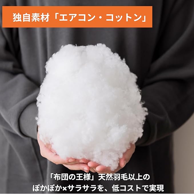 【人気の理由2】布団の王様「天然羽毛」を超えた、独自開発素材「エアコン・コットン」。羽毛は寝具業界では昔から天然のエアコンとも呼ばれ最高の素材とされてきました。その理由は寒い時には熱を抱え、暑い時には湿気と熱を放出する、その温度と湿度の自動調整機能にあります。IWONUが開発した「エアコン・コットン」は人工素材でその特徴を再現し、さらに羽毛の弱点を克服し、低コストでの生産を可能にしました。