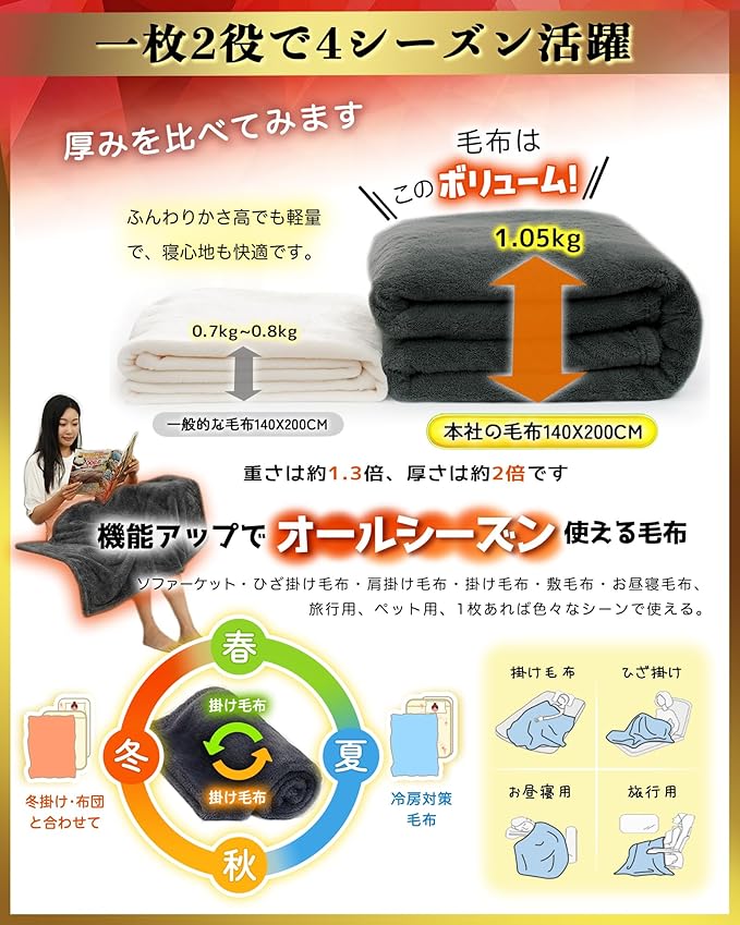 【軽くて暖かい毛布】一般的に流通された2枚合わせの毛布と比べ、本製品は1枚のフランネルあったか毛布に仕上げ、両面共に起毛させるのが特徴で、優れた肌触りを誇ります。長い毛足を高密度に織り上げ、毛足に空気を多く包み込んでいるため、あったか空気をしっかりと閉じ込め、蓄熱保温性に優れています。ふわふわで掛け毛布を手で触れば、その感触は非常に柔らかく滑らかなものとなっており、使うたびにうっとりするような心地よさが生まれます。さらに軽量でご使用時の圧迫感を感じにくく、快適にご使用いいただけます。