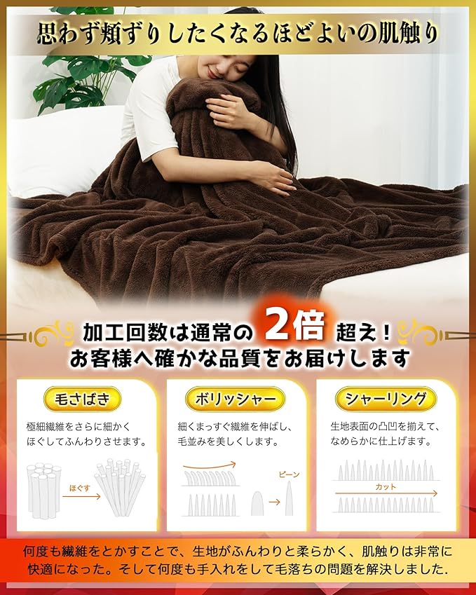 【極上のあふれる肌触り実現】マイクロファイバー生地を高密度に織ったプレミアムフランネル生地を加工することで極上の手触りを実現します。加工回数は通常の2倍を超え、極細繊維をさらに細かくほぐしてふんわりさせて、細かくまっすぐ繊維を伸ばし、毛並みを美しくして、生地を表面を凸凹を揃えて、なめらかに仕上げます。温かい毛布をそっと撫でただけでも、その柔らかさやふわふわ感による暖かさを実感していただけます。多数の加工によると毛羽脱落も改善し、長期に使い続けられるのは、大きな魅力です。