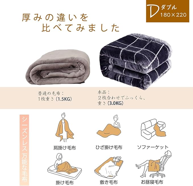 【様々な用途】敷き毛布、掛けもうふ(春 ・ 秋 ・ 夏)、布団の中掛け(冬場)、ソファー用毛布、お昼寝用毛布、車用毛布、肩掛け毛布、ひざ掛け毛布、子供用毛布、いろいろ場面で使えます