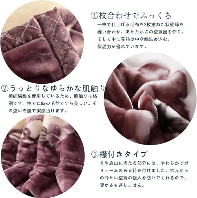 【2枚合わせの厚さ】厚地のもうふ二枚合わせの仕様、ふわりと起毛したフランネル生地&吸湿発熱効果のあるマイクロファイバーを中わたに使用!通気性がもっと良い、暖かさも2倍!さらに、衿つき仕様で暖かさを逃がさない。暖かくて厚いので冬など寒い時期には重宝するのがフランネル生地のアイテムです