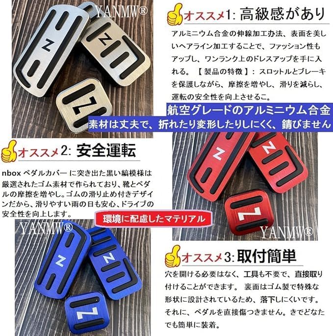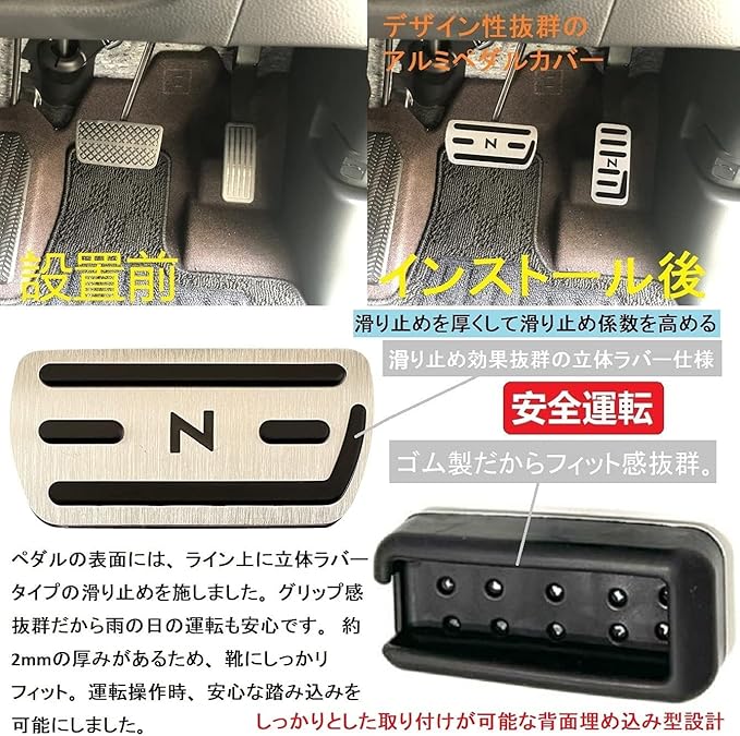 【取付簡単】穴を開ける必要はなく、工具も不要で、直接取り付けることができます。 裏面はゴム製で特殊な形状に設計されているため、落下しにくいです。それに、ペダルを直接傷つきません。純正のペダルカバーを取外し、取り付けるだけの簡単装着で女性の方でも簡単に装着が可能です。【取付方法】:1.アクセルペダルは純正ペダルの上から本製品を被せてください2.ブレーキペダルは純正のゴムカバーを外してからお取付ください。3.パーキングペダル:パーキングペダル は純正ペダルの上から本製品を被せてください。
