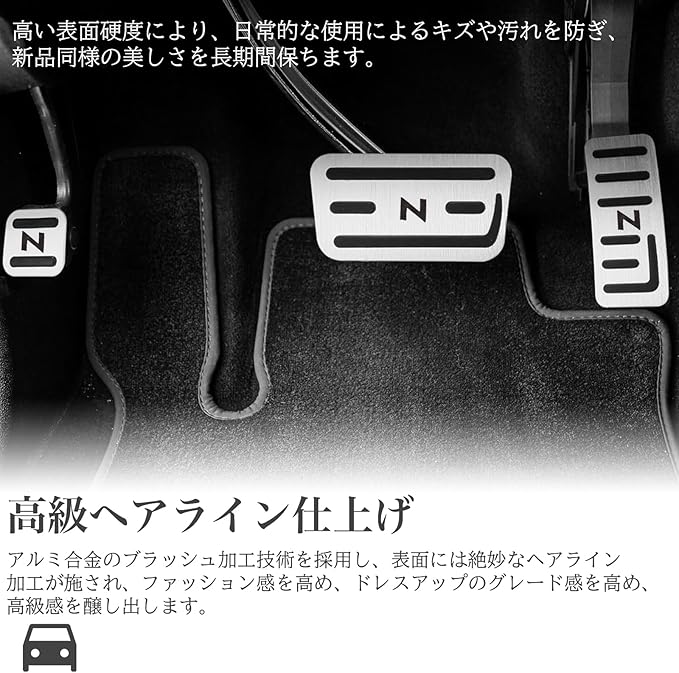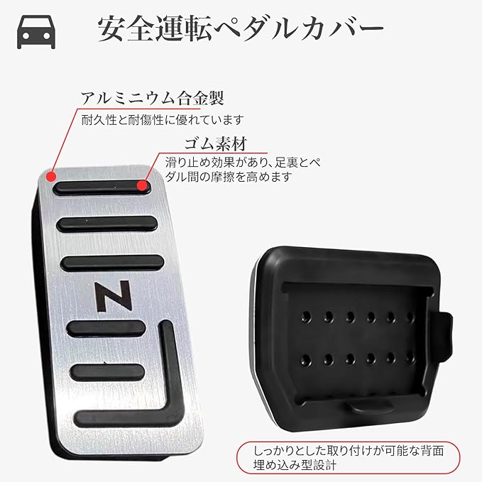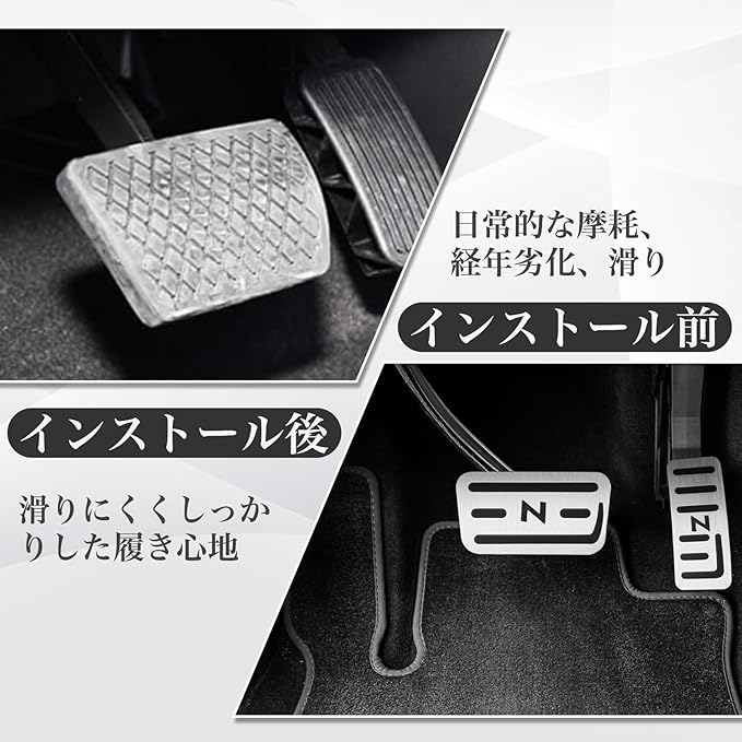 【素材の特徴】ペダルカバーは高品質のアルミ合金製で、耐久性と耐傷性に優れています。製品表面はゴム素材で、滑り止め効果を発揮し、足裏とペダルの摩擦を高めます。特に日本の雨天時の安全運転に最適です。