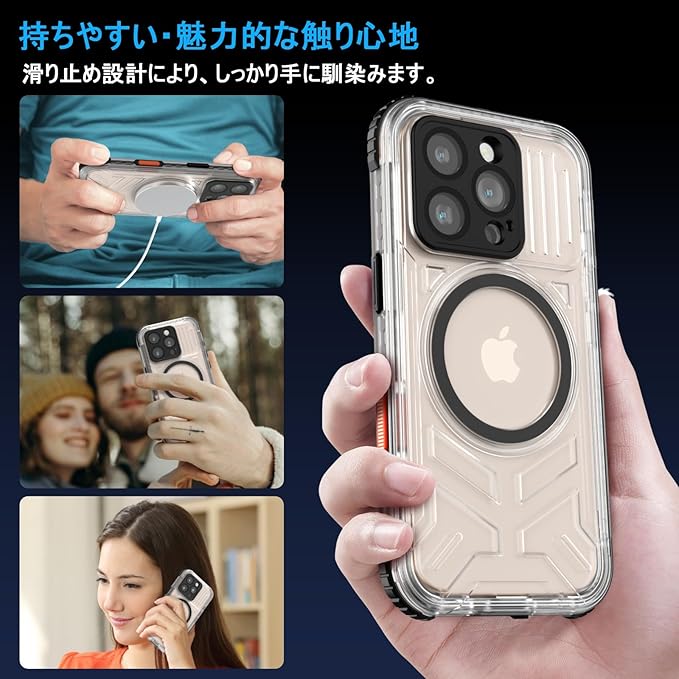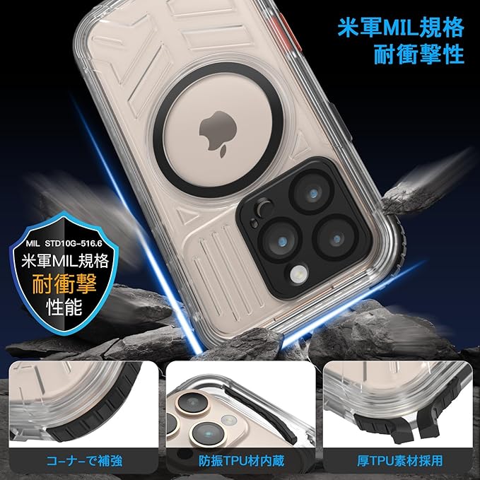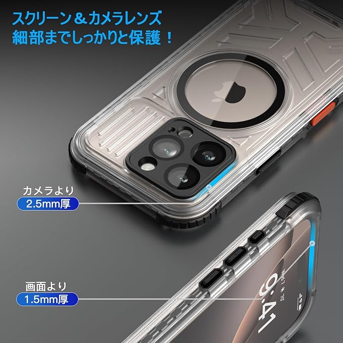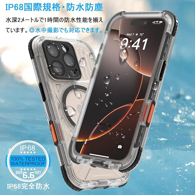 【IP68規格・防水防塵】対応機種 :iPhone 16 Pro Max 完全防水防塵 ケース。1000回以上の水中2m/6.6ft深さ/1時間のテストに合格しました。完全防水・防塵・防雪の仕様により、お風呂、温泉、海、スキー、登山などにご安心してお使いいただけます。水中撮影でも対応出来ます。