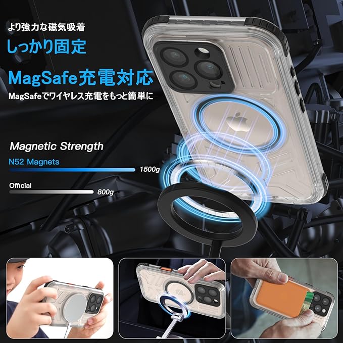 【MagSafe対応・充電効率抜群】マグネットが内蔵されており、吸着力を高め、安定感をアップしてエネ損失なしの快速ワイヤレス充電できます。MagSafe対応充電器および各種MagSafe専用アクセサリー、車載スタンドなどで安定した状態を保ち、充電が途切れることや落ちる心配はありません。