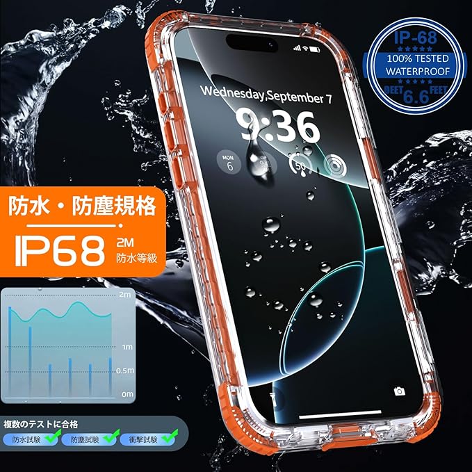 【IP68防水認証取得】iPhone 16 Pro Max 専用の完全防水防塵ケースです。最高防水レベルのIP68認証を取得し、水深さ2Mの水中に1時間まで水没でき、さらに水中撮影でも対応出来ます。防水機能だけでなく、砂・ホコリ・ゴミなどの侵入も防ぎますので、お風呂、水泳、釣り、温泉、登山、キャンプ、いつでもどこでもスマホをご安心してお使いいただけます。