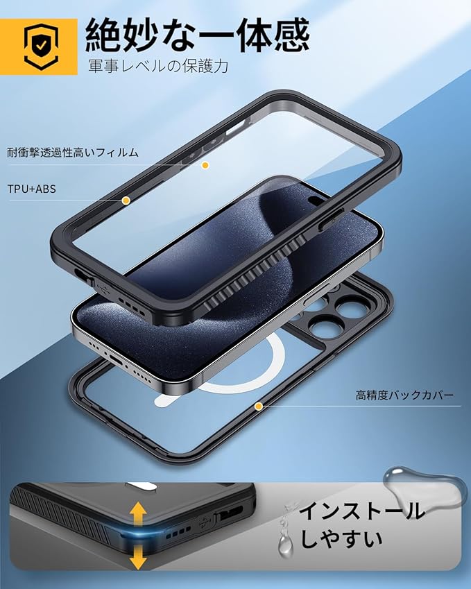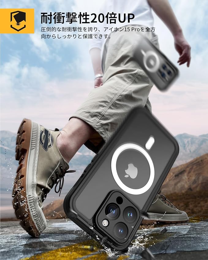 【強防衝撃力・360 保護】軍用MIL規格810G-516防振材料が採用されていますので、衝撃にとても強いです。iPhone 15 プロマックス防水ケースの嵌め込み式前カバーと透明バックカバーの組み合わせにより、360 全方位からiPhone 15 プロマックスを保護してくれます。落下、衝撃、擦れ傷など一切心配ありません。粉塵も中に入らない、砂や埃が舞う過酷な環境でも端末をしっかり包んで保護します。