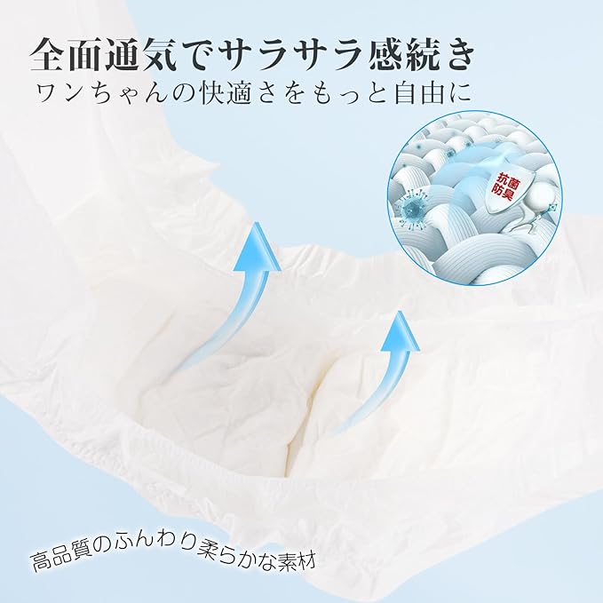 【ふわさら肌触り&全面通気シート】肌にあたる部分なので、やさしい肌触りの通気性の良い素材を使用、長時間付けていても蒸れにくい!【抗菌防臭加工】犬用おむつは抗菌防臭加工でいつも清潔!