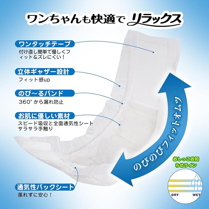 【便利なおしっこお知らせライン付き!】おしっこしたら犬おむつの黄色のラインが青色に変わってお知らせしてくれてとっても便利! 【つけ直しらくらくテープ】面ファスナーが幅広く愛犬のサイズにピッタリ合わせることができます。のびのび立体モレ防止ギャザーで、お腹から腰部分に巻くだけで手軽に装着できるため、お出かけ時のマーキング対策にうってつけ。