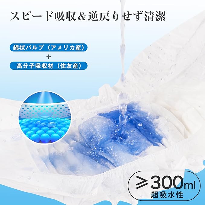 【6層構造&安心の12時間超吸収】犬用オムツは「吸水性」と「アンモニア消臭機能」に優れた綿状パルプ、吸水紙、高分子吸収材を使用、吸収面積も広がり、尿を素早く吸収し、ゼリー状に固めて逆戻りしません!肌面はさらさら感が続き快適、長時間使用でも安心できます。