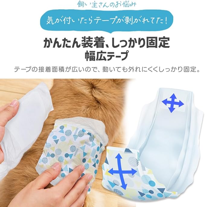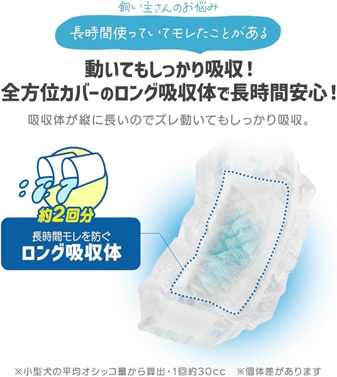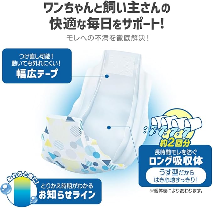 ワンちゃんと飼い主さんの快適な毎日をサポート!モレへの不満を徹底解決!長時間モレを防ぐロング吸収体全方位カバーで横モレも防ぐ!