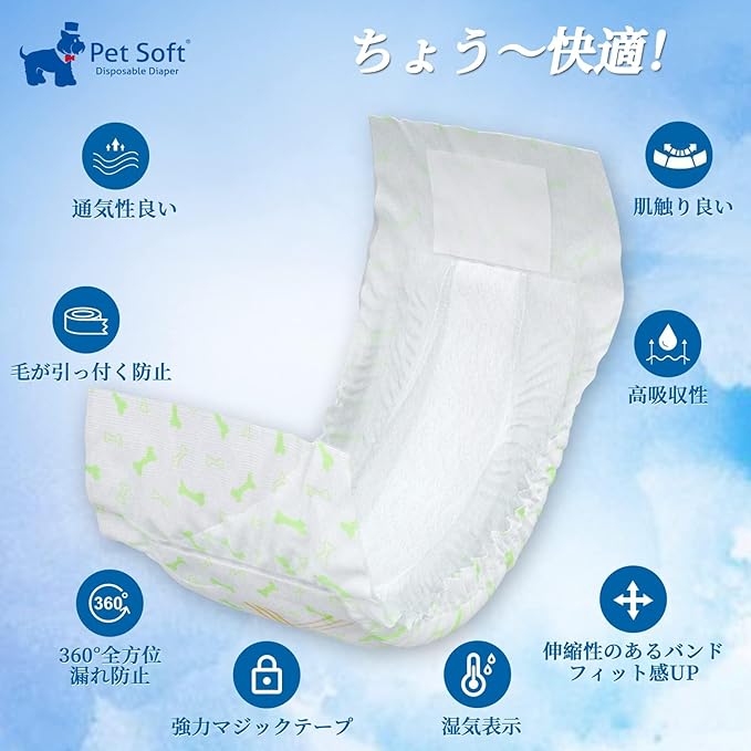 思いやりのデザイン:おむつにおしっこのお知らせラインが付いて、ワンちゃんがオシッコをしたら、オムツがおしっこを検出することができ、お知らせラインは乾燥状態の黄色から湿気状態の緑へ変色します、おむつ専用のマジックテープを採用し、ワンコの体によって調整、ぴったり装着できます、ワンタッチテープで幅が広く、何度もつけ直しでき、ペットの体型にフィットしていつも快適、腹巻風なので、巻くだけで簡単に装着できます