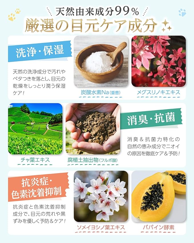 ✅ 【天然由来の洗浄・消臭・抗菌成分で目元お任せ】 重曹・フルボ酸・パパイン酵素など、たっぷり贅沢配合の天然由来ケア成分で汚れ・ニオイ・かゆみなどの目元悩みにアプローチ!