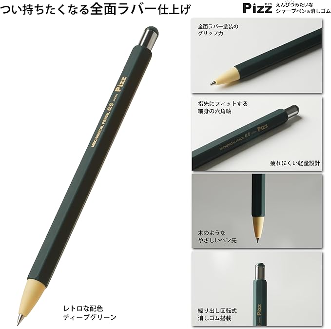 【特徴】超軽量の「六角ボディ」と「全面ラバー塗装」が持ち手にしっかりフィット。「繰り出し式の消しゴム」と楽しく消せる「六角消しゴム」付きで、書くことが楽しくなります。