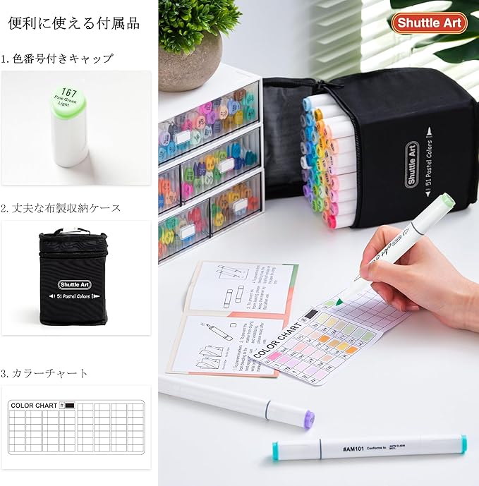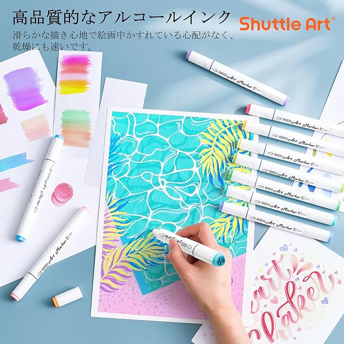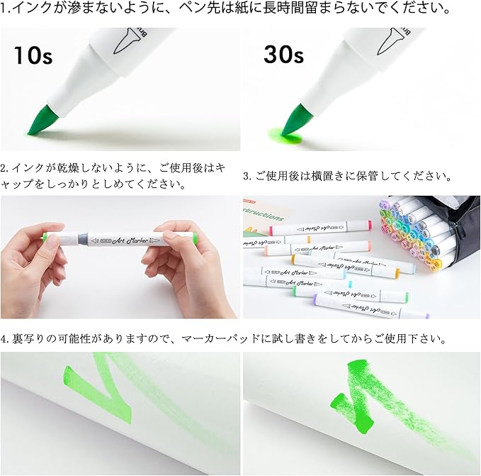 【様々な用途】手帳・塗り絵・デザイン・コミック・漫画・スケッチ・落書きなど、様々な用途を持つお絵描きセットです。◎ご注意:ご使用中にペン先は長時間紙に留まらないでください。マーカーパッド以外に紙質によっては裏写りの可能性がありますので、試し書きや裏写し防止シートを使うことなどしてください。ご使用後はキャップをしっかりしめて横置きに保管するようお勧めします。