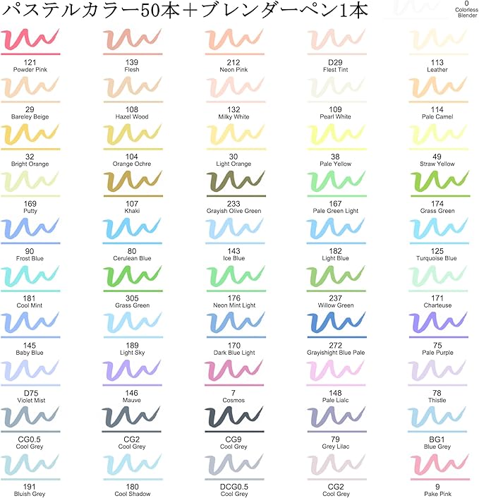 【パステルカラー50色】豊富なカラーバリエーションを持ち、淡い色合いのイラストマーカー50色セットです。柔らかい発色で、チカチカしなく、目に優しいです。べレンダーペン付きで、色混ぜやぼかしなどができ、色の表現の幅がよりよく広がります。丈夫な布製キャリング―ケースが付き、収納も携帯も便利で、子供やマンガ描きが好きな人などにプレゼントしても最適です。カラーチャートも一枚付属し、必要な色がお手軽にお探しいただけます。