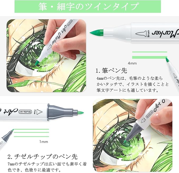 【筆・細字のツインマーカーペン】ペン先は筆と細字のツインタイプです。1mmの細字タイプは細かい所を塗る・細い線を書くことに最適です。4mmの筆タイプほどよくコシがあり、筆圧の強弱により、異なる線質が表現でき、グラデーションもしやすいです。繊細な着色も得意で、自由にお絵描きが楽しめます。に基づいた三角軸は持ちやすく、子供から大人まで誰でも馴染めます一方、滑らかな表面でのころがりも防げます。