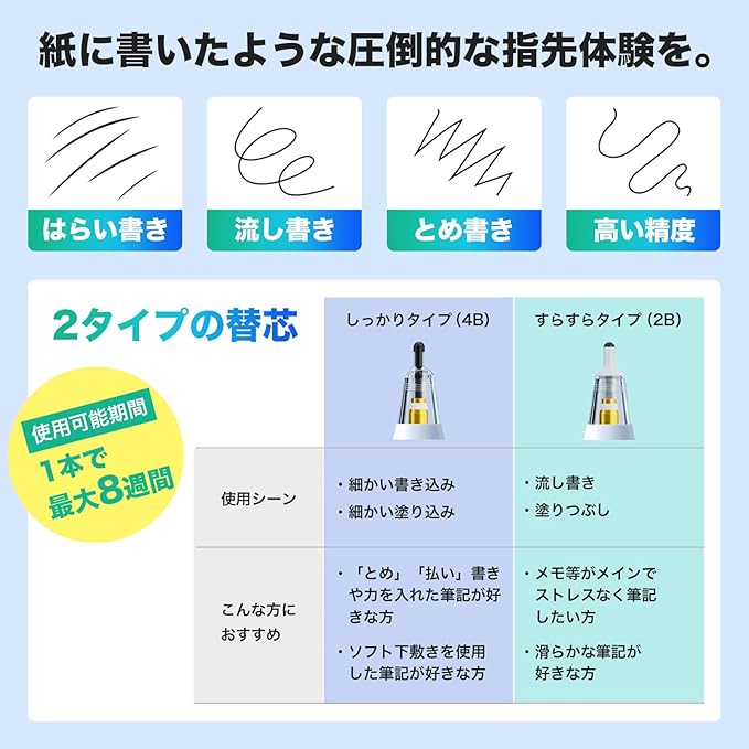【書き味の向上】紙に書くような「よりリアルな筆記」を追求するために、2つの異なるタイプのペン先(4B/2B)を開発しました。