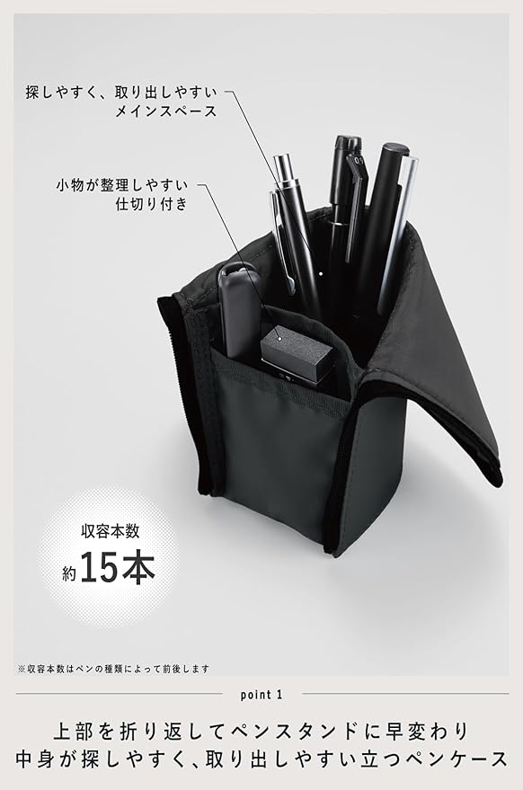 【POINT2:デスクになじむシンプルなデザインと持ち運びに便利なスリムな形。】約15本のペン類が収容可能で、仕分けに便利な小物ポケット付き。