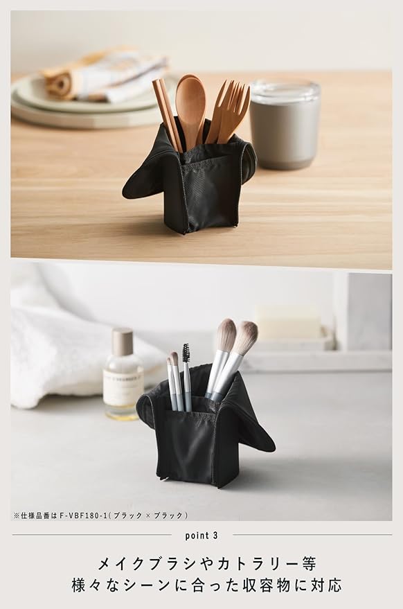 【POINT3:メイクブラシやカトラリー収容等、様々なシーンに合った使い方が可能。】小さなスペースにも立てて置けるため、外出先でも便利。