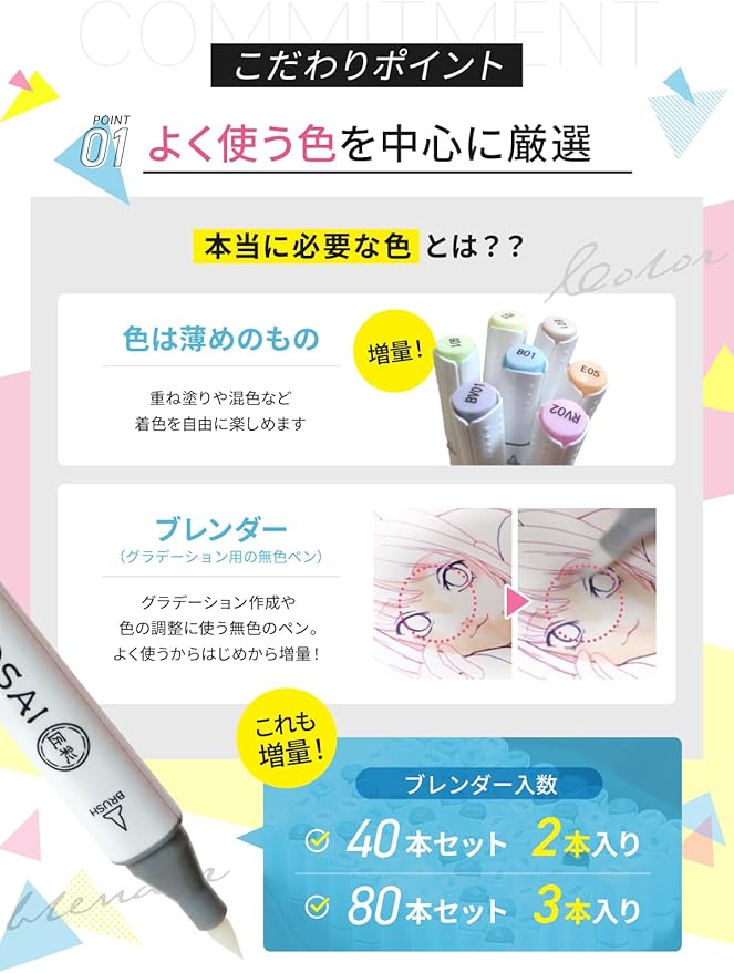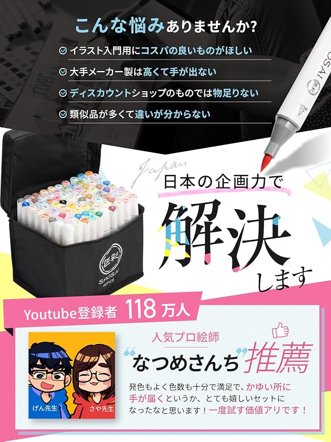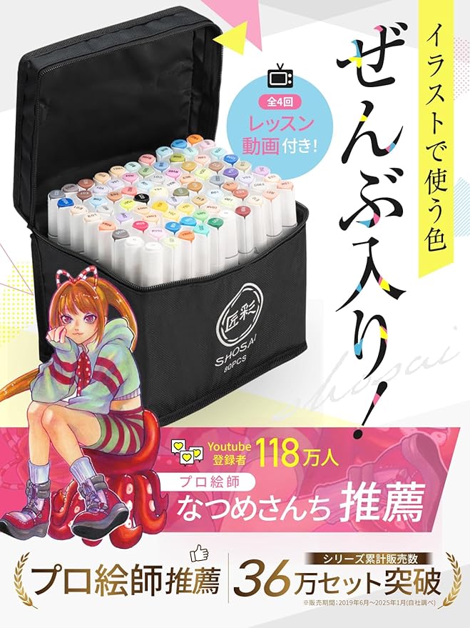 【プロ絵師推薦のセット色と発色の イラストマーカー 】プロ絵師のなつめさんち様に、 マーカーペン の配色について簡易監修していただきました。 肌の色やよく使う色、グラデーション用のブレンダーを多く同梱