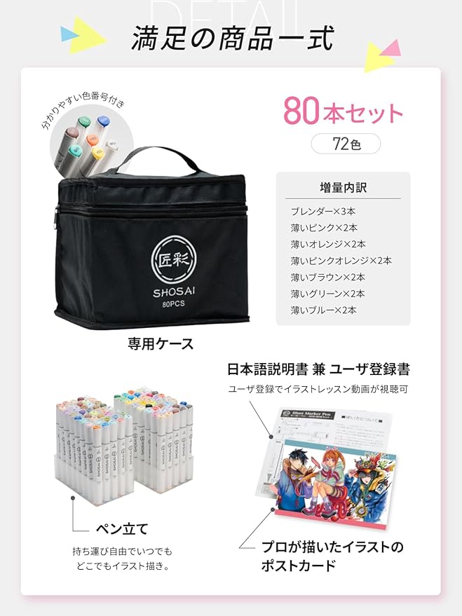 【 初心者 にピッタリの 入門 お絵描きセット 】 ペンセット 、ペン立てと 収納ケース 、 ユーザ登録書を兼ねた日本語説明書、おまけのポストカードと、イラストに必要なものが初めから揃っています。