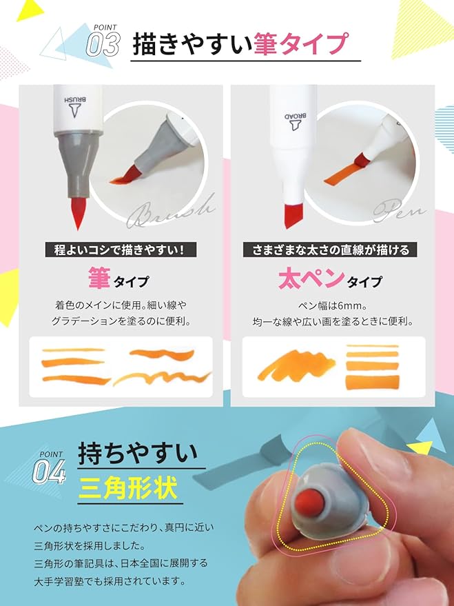 【 筆ペン ・ 太ペン の両端タイプと三角形状で 漫画家セット に最適】 筆・太ペンの 太細両端 仕様で、 お絵描き が自由に楽しめます。 持ち手は 丸に近い三角形状で ペン 自体が持ちやすいです