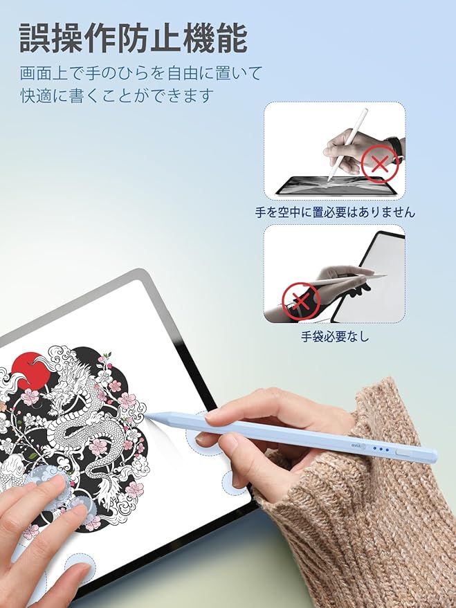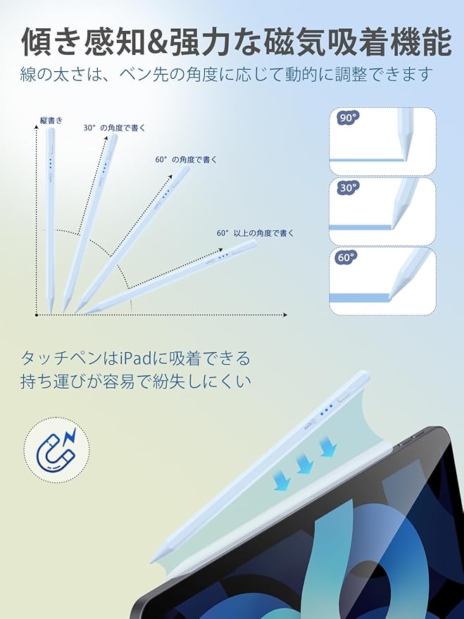 【磁力吸着&誤タッチ防止&傾き感知】Vivid Tech iPadタッチペンには2つの強力なマグネットが内蔵されており、iPadにしっかりと吸着させ、収納しやすくなっています。出張や会議などの場面で携帯することも可能です。 Vivid Tech iPadタッチペンには誤タッチ防止機能が備わっており、手を自由に置いて紙で描くように感じることができます。手袋をつける必要はありません。 Vivid Tech iPadタッチペンには傾き感知機能があり、ペン先端の角度に応じて線の太さを動的に調整することができます。これは絵を描く際に非常に適しています!Bluetoothに接続する必要もなく、面倒な設定は不要です。ペンの先端をクリックして電源をオンオフするだけなので、非常に簡単です。