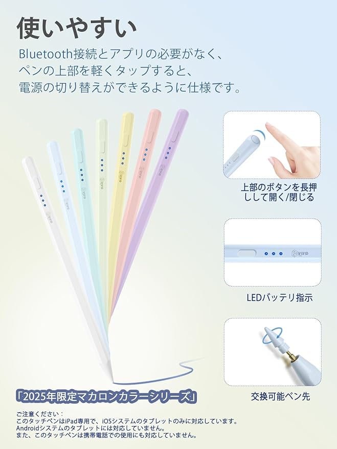 【広範な互換性】Vivid Tech iPadタッチペンは2018年以降に製造されたiPad製品と互換性があります。iPad(第6世代/第7世代/第8世代/第9世代/第10世代)、iPad Pro(第3世代/第4世代/第5世代/第6世代)、iPad Pro 11インチ、iPad Air(第3世代/第4世代/第5世代)、iPad mini(第5世代/第6世代)に対応しています。(注意:Vivid Tech iPadタッチペンはiPad専用のタッチペンであり、AndroidタブレットやiPhoneでは使用できません)1年間の.サービスを提供しており、製品説明書には使用説明のビデオがあります。また、不明な点がございましたら、いつでもご連絡ください。