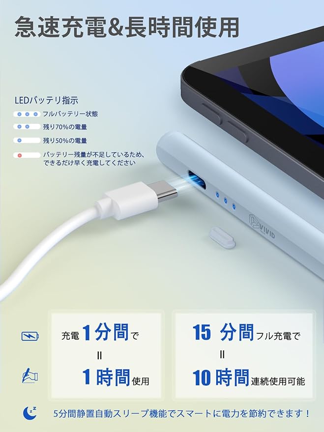 【高速充電、長時間使用可能】これはUSB-C充電タッチペンで、高速充電に対応しており、約1時間使用できるように1分間で急速充電できます。30分間で完全充電すると、最大10時間使用できます。長時間活動しないと自動的にスリープモードになり、30分間活動しなければ自動的に電源がオフになります。これは電源を忘れずにオフするのを防ぎ、.の節約にもつながります。(Type-Cコネクタも同梱しており、iPad上で直接充電することができますので、より充電が便利です!)