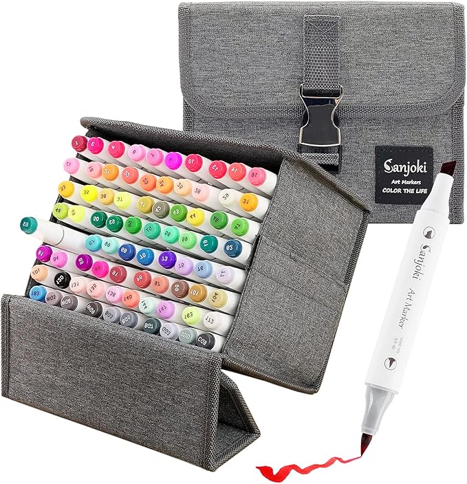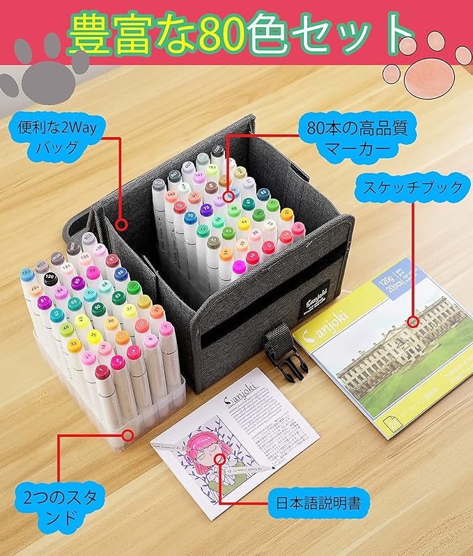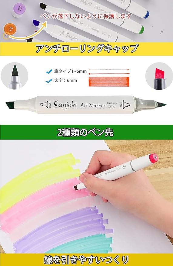 「80本筆タイプ」80本イラストマーカー、2種類のペン先、高品質な染料インクを採用しています。発色が鮮やかで細かく描くことができ、定着性が強く、変色や退色もは少ないです。普通の紙だけではなく、プラスチックカップや布、やセラミックス、や木製品などに塗ることができます。