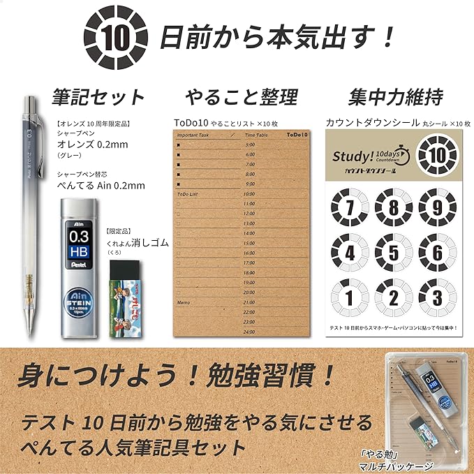 【セット内容】 シャープペン、シャープ芯、消しゴム、ToDoリスト(10枚)、カウントダウンシール(10枚)