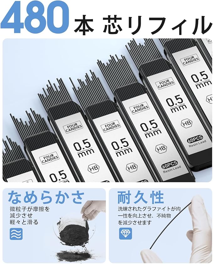 【480本入り樹脂芯】8チューブ60本入りの超容量芯。芯を削る必要がなく、折れにくい樹脂芯で、なめらかな書き味とくっきりとした濃い線を実現。