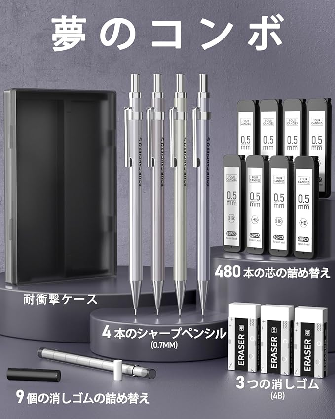【セット内容】0.5mm製図用シャープペンシル4本、2号芯(HB)8本、4B消しゴム3個、消しゴムリフィル9個。