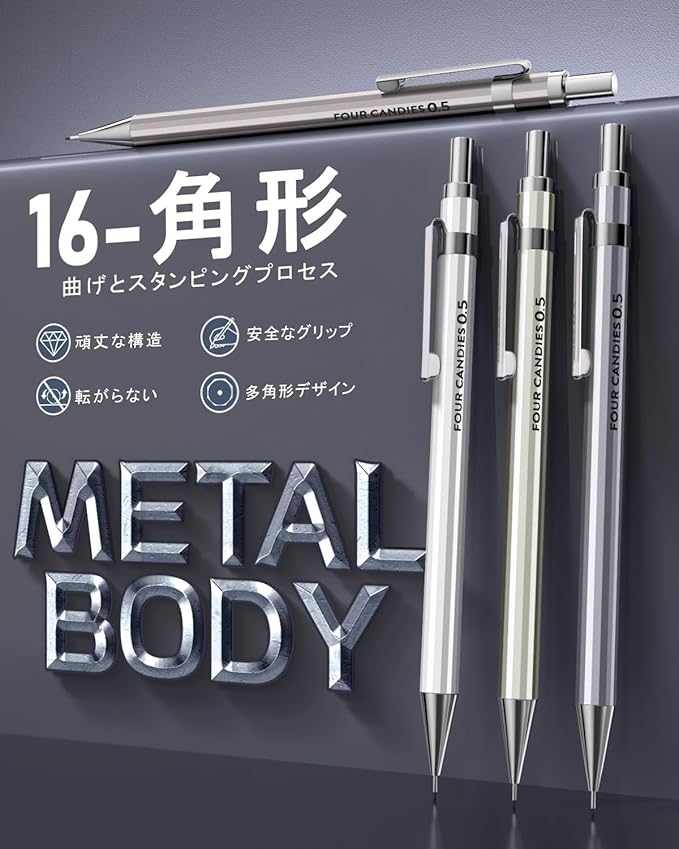【滑り止め&使いやすさ】芯がデスクトップで滑らないように、金属クリップと多角形の軸が付属しています。誰でも簡単に芯を繰り出すことができます。