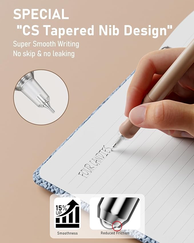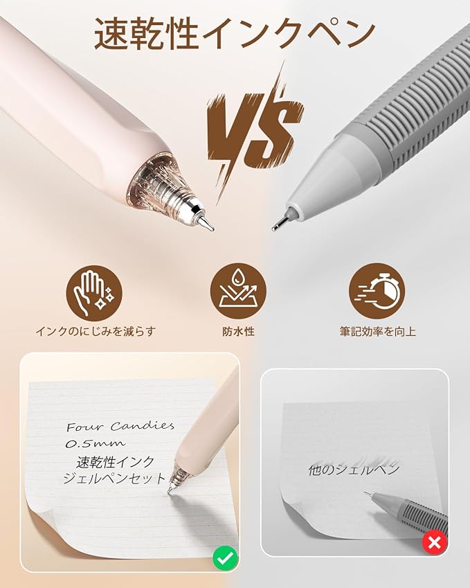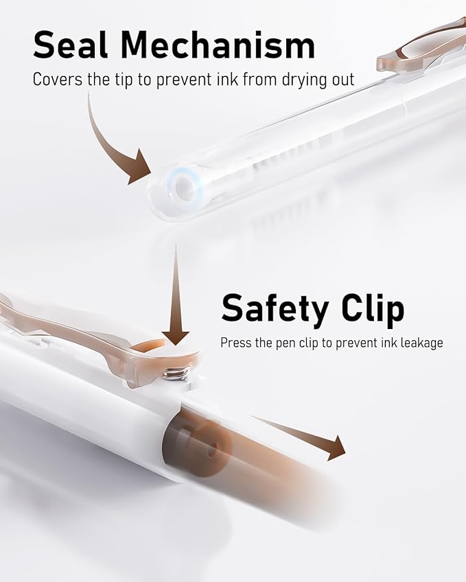 [プレミアム速乾インク]このブラックインクペンはプレミアムゲル速乾インクを使用しており、すぐに乾くので紙を汚さず、インク漏れもありません。各ペン先はワックスで密封されており、インクの乾燥を防ぎます。左利きの方や、筆記中に手を引きずりがちな方に最適です。