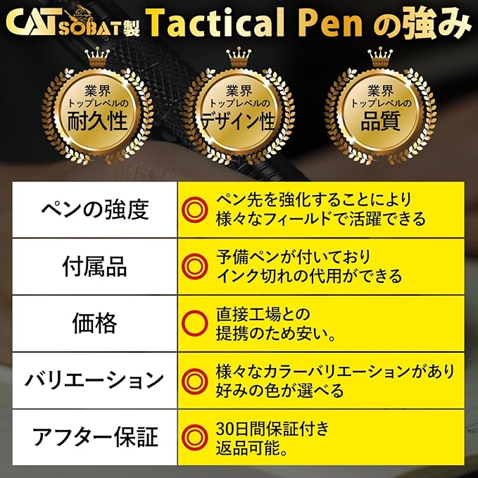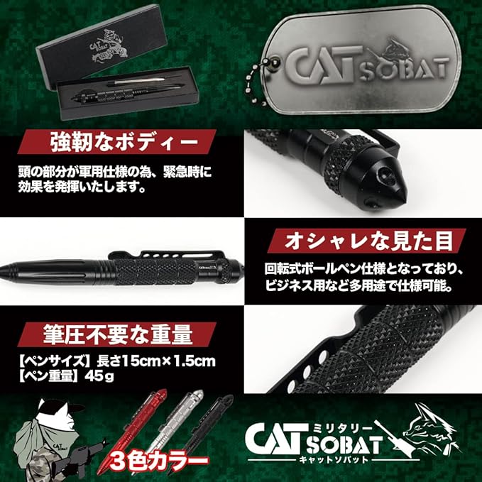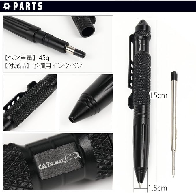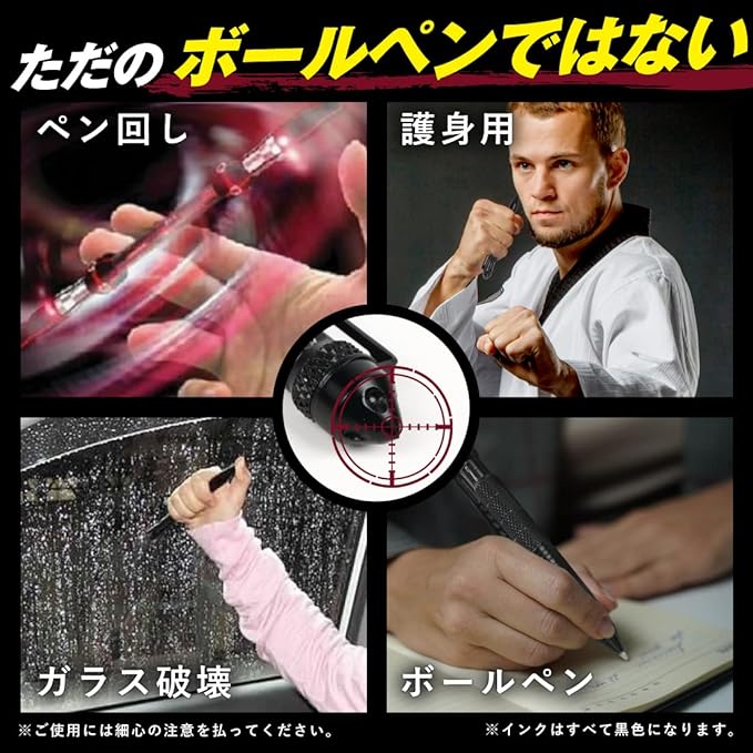 【商品PR】✅見た目は日常的に使える回転式ボールペンですが、 緊急時には防犯用・護身用タクティカルペンとして高い効果を発揮します。 軽量かつ耐久性の高いアルミ合金製で、携帯性と実用性を両立。 窓ガラス破砕(グラスブレーカー)機能を備え、アウトドアや災害時にも役立ちます。 【商品PR】✅普段はペンとしてビジネス・学校・日常生活で使用でき、いざという時には自己防衛ツールとしてあなたを守ります。予備インク付きで長くお使いいただけます。 ※護身用具として使用する際は、必ず法律やマナーを守り、細心の注意を払ってください。