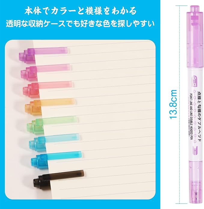 【様々な利用シーン】デザイン:点線/花/星/ハート/曲線 全8色:ブラック、ミッドナイト、スカイブルー、オレンジ、レッド、パープル、ローズレッド、グリーン カーブペンサイズ:13.8cm カーブペン重量:7.8g 透明ケースサイズ:14*9.5*1.5cm 重量:82g 透明な収納ケースが付いており、持ち運びも自由自在です。 内容チェックをしたり、アンダーラインを引いたりするのはもちろん、年賀状・手帳・家計簿やノートのマーキング、印つけや図面の色分け等にも簡単に使えます。マーキングに限らず、プレゼントとして塗り絵・イラスト描き・グリーティングカード・メッセージカードの創作でも活躍します。 8色カラーペンは環境に優しい素材を厳選して使用しております。嫌な匂いが一切なく、大人からお子様まで安心してお使いいただけます。気軽な贈り物、新学期や誕生日などのプレゼントとしてもお勧めです。