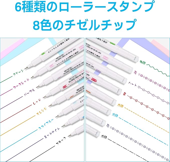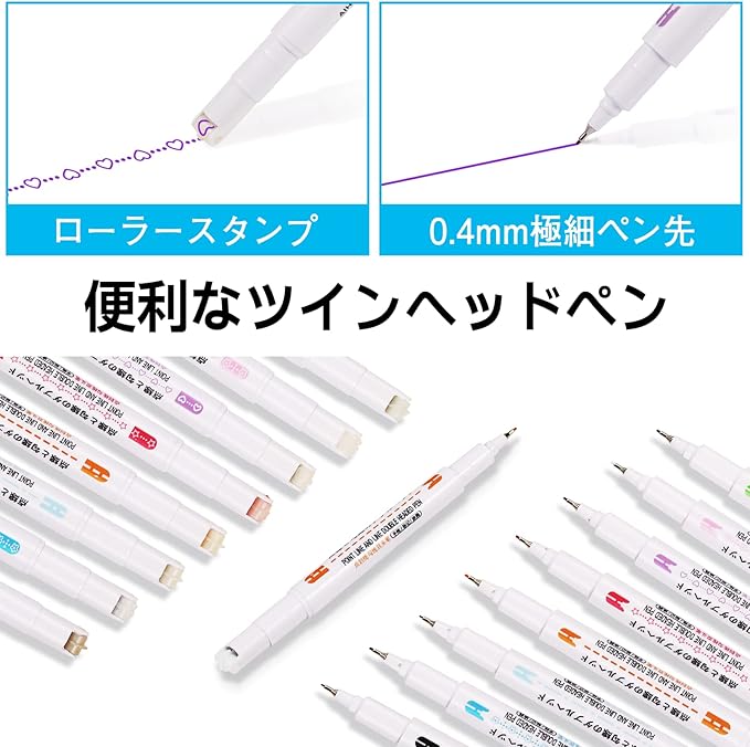 【ツインマーカーペン】 6種類のローラースタンプと鮮やかな8色のチゼルチップを組み合わせたデュアルヘッドペンで、用途に応じて自由にお使いいただけます。ローラースタンプを使えば、花模様 星模様 ハート模様・点線・波線が簡単に描け、0.4mmの細字ペン先は、ご家庭カレンダーに記念日の記入やノートへの書き込み、細かい所を塗る・細い線を書くなど、様々な表現が可能になります。