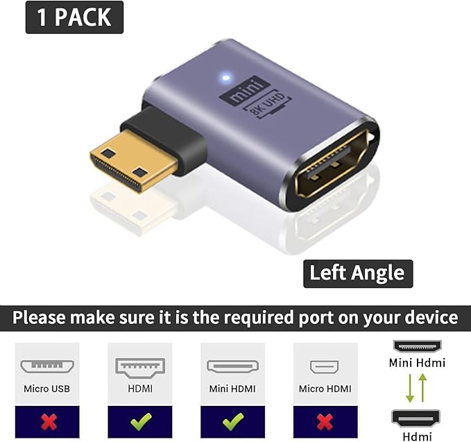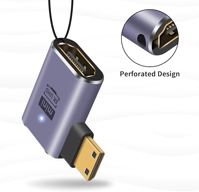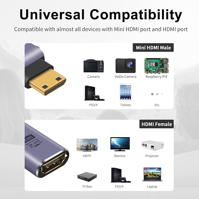 Mini HDMI to HDMI変換アダプタ、最新のhdmi 2.1規格(8K @60Hz /4 kビデオ60 hz、2160p、48 bit/pxの色深度)を満たし、最大48 gbpsの帯域幅をサポートし、以前のバージョンと下位互換性があります。