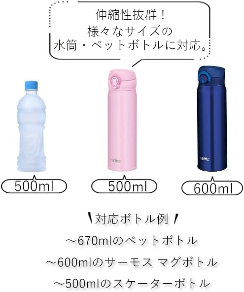 伸縮性が高い素材なので600mlまでのペットボトルや水筒にフィットします。