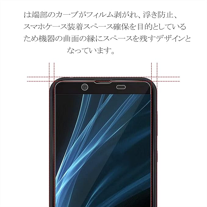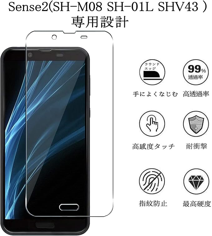 『 対応機種 』Sense2 (SHV43 SH-01L SH-M08) に適応しています。携帯は端部のカーブがフィルム剥がれ、浮きの防止、スマホケース装着スペース確保のため、機器の曲面の縁にスペースを残すデザインとなっています。