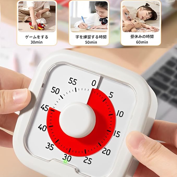 【時間感覚を育む タイマー 子供】シンプルな回転操作で0〜60分を設定。時計が読めないお子様でも残り時間が分かり、時間管理能力と集中力の向上をサポートします。