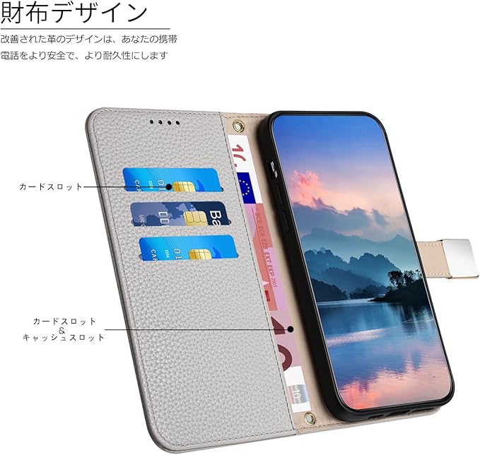 【優れた素材】外部のカバーは高品質なPUレザー素材と中身は柔軟なTPU素材で作られて、落下時の衝撃吸収に強いです。手帳型ならではの全面保護機能でディスプレイはもちろん、背面もしっかりガードします。カメラレンズ保護構造付きでスマホ本体をガッチリ保護します。シンプルなデザインで、高級感が溢れます。