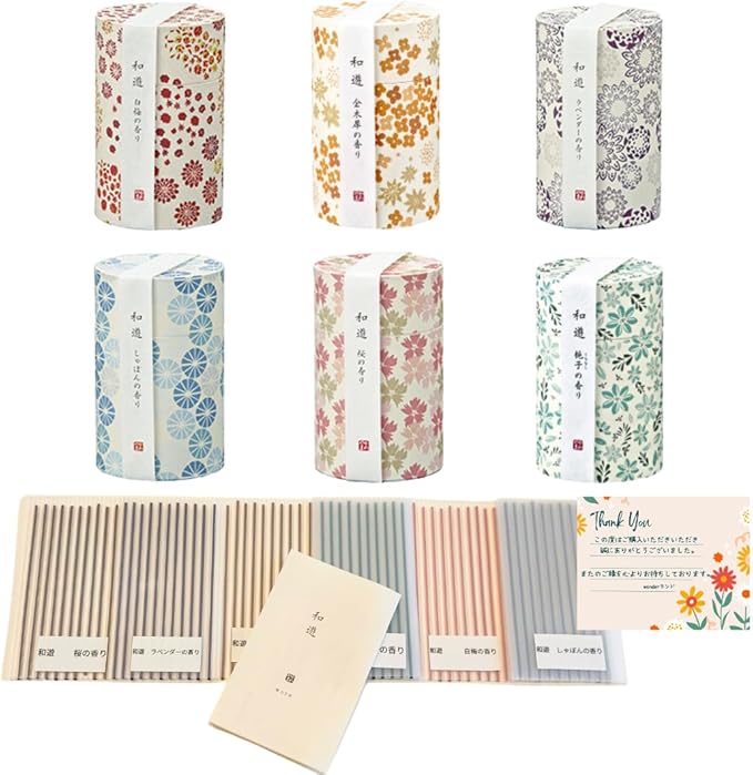 香りの種類:1白梅、2キンモクセイ、3ラベンダー、4クチナシ、5シャボン、6桜の香りの合計6種となります。 輸送の際に折れたりしないようにハードケースに10本ずつに入れた物となりますので、ご安心してご注文いただけます。