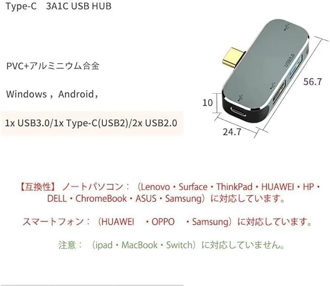 【互換性】 ノートパソコン:(Switch・Lenovo・Surface・ThinkPad・HUAWEI・HP・DELL・ChromeBook・ASUS・Samsung)に対応しています。 スマートフォン:(HUAWEI ・OPPO ・Samsung)に対応しています。 ※ご注意:Type Cポート充電不可です、データ転送のはOKです。