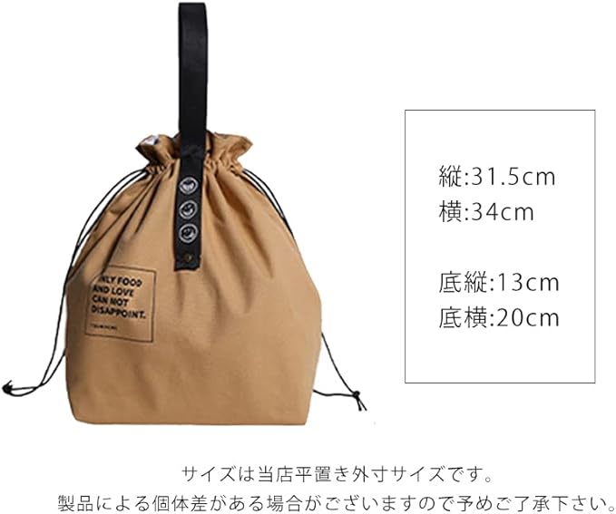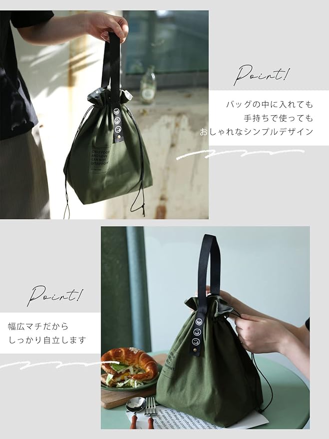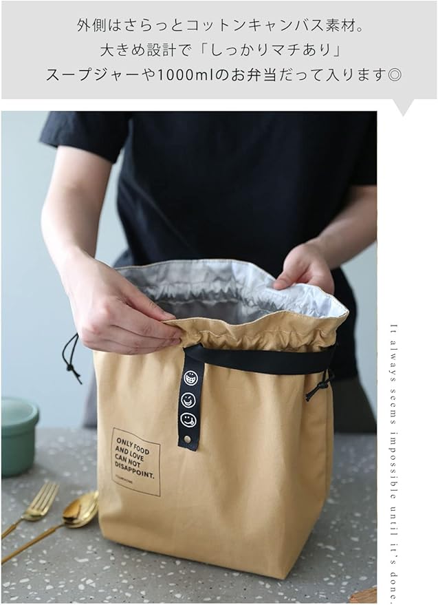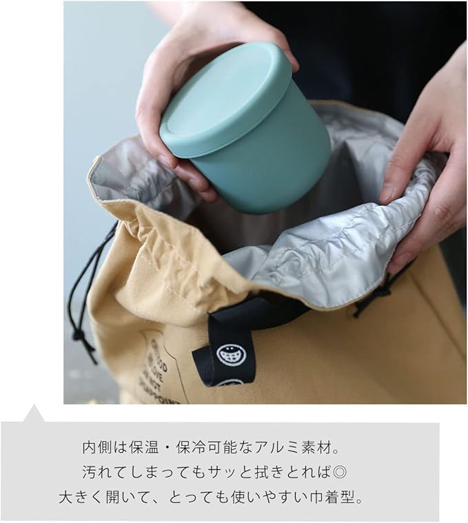 【保温・保冷】で安心のランチバッグ。 大きく開いて、とっても使いやすい巾着型。 バッグの中に入れるのはもちろん、 オシャレなシンプルデザインなので手持ちで使っても◎内側は保冷・保温のアルミ素材。 汚れてしまってもサッと拭き取れて衛生的です。 大きめ設定で「しっかりマチあり」 幅広マチなので、しっかり自立◎ スープジャーや1000mlのお弁当など見た目以上にたっぷり入ります。