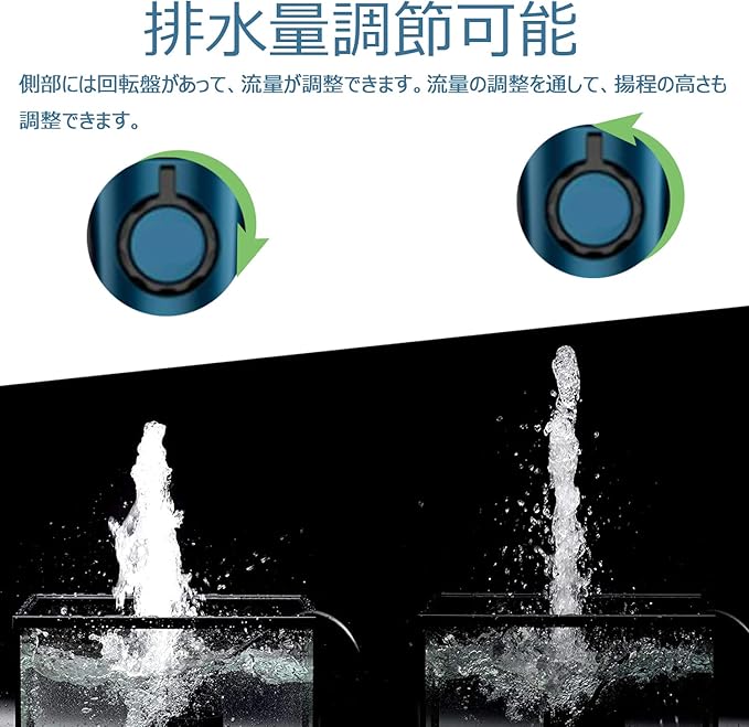 【吐出量調整可能】循環ポンプの正面に流量調整ノッブが付いて、吐出量が最大2500L/Hまで、揚程は2.5Mまで調整できます。流量の調整を通して、揚程の高さも微調整できます。(揚程量は水道管の揚水高さであり、給水ポンプが直接に噴水の高さが大きく違います。)